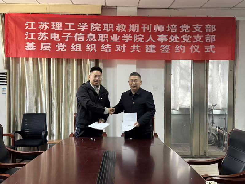 会上,江苏电子信息职业学院人事处卢新文处长介绍了学校师资队伍建设、人事处党支部党建工作情况以及结对共建协议书的核心内容;职教期刊师培党支部书记王尧介绍了本支部党建工作情况。双方本着加强工作交流、提升党建工作质量的目标,签订了结对共建协议。