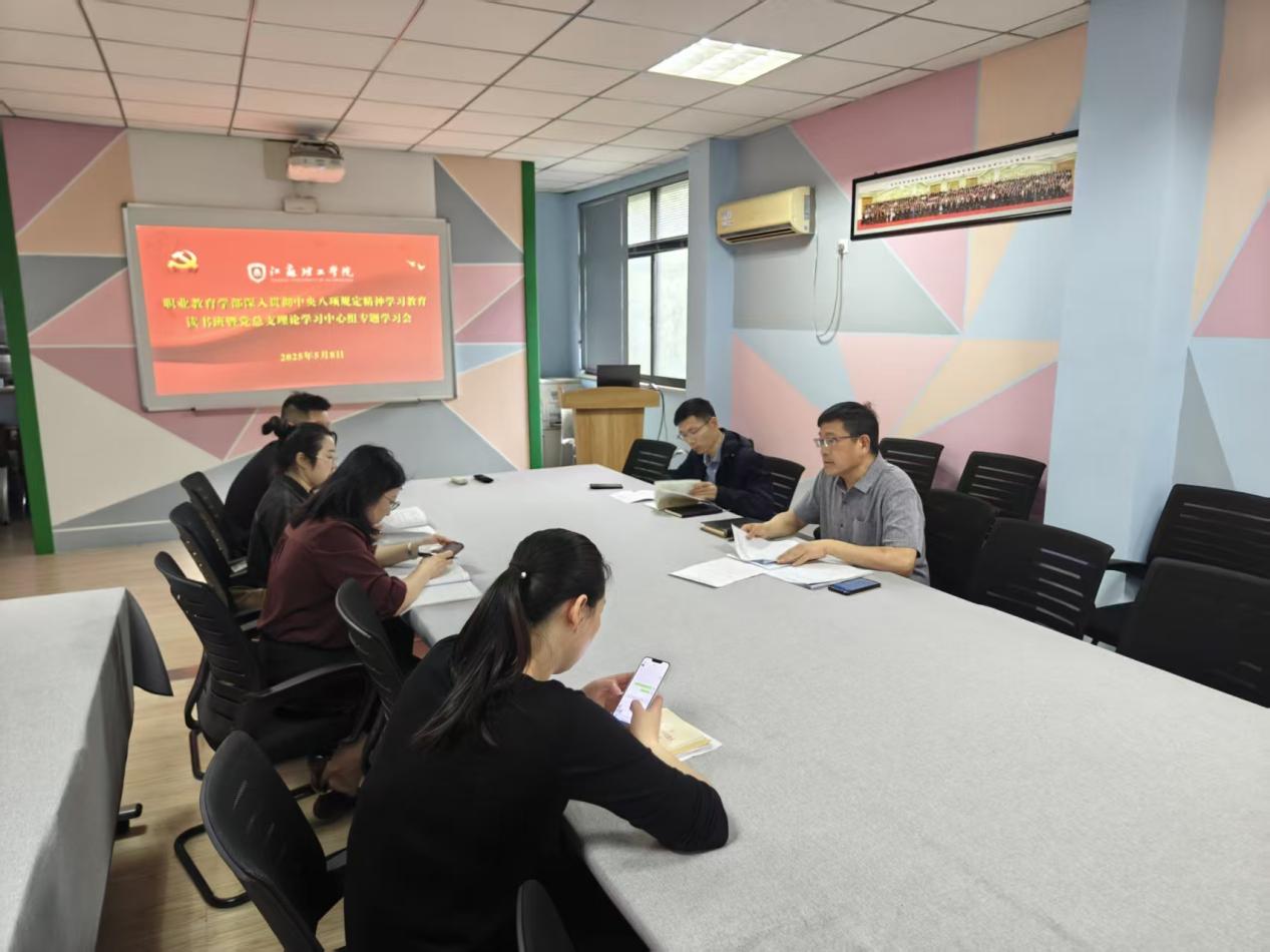 5月8日下午,职业教育学部在49号楼201会议室召开党总支理论学习中心组专题学习会,学习贯彻2025年全国两会精神,深入学习领会习近平总书记对江苏工作的重要讲话重要指示精神。理论学习中心组全体成员工参加了会议。会议由党总支书记郭耿玉同志主持。